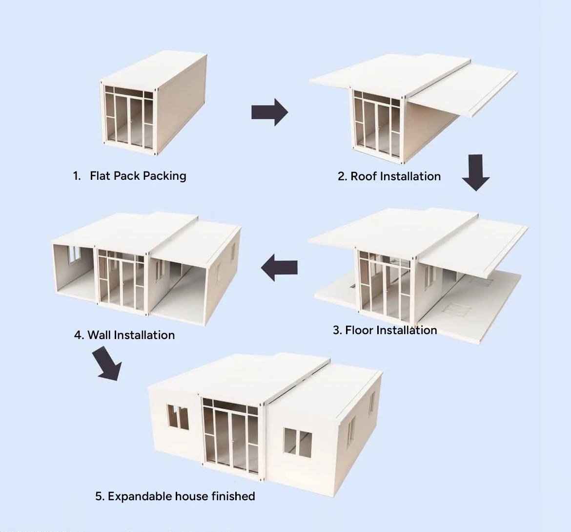 Once your order is placed and construction is complete, your expandable home is delivered to your desired location. Upon arrival, it is swiftly expanded and set up, ready for use in no time.